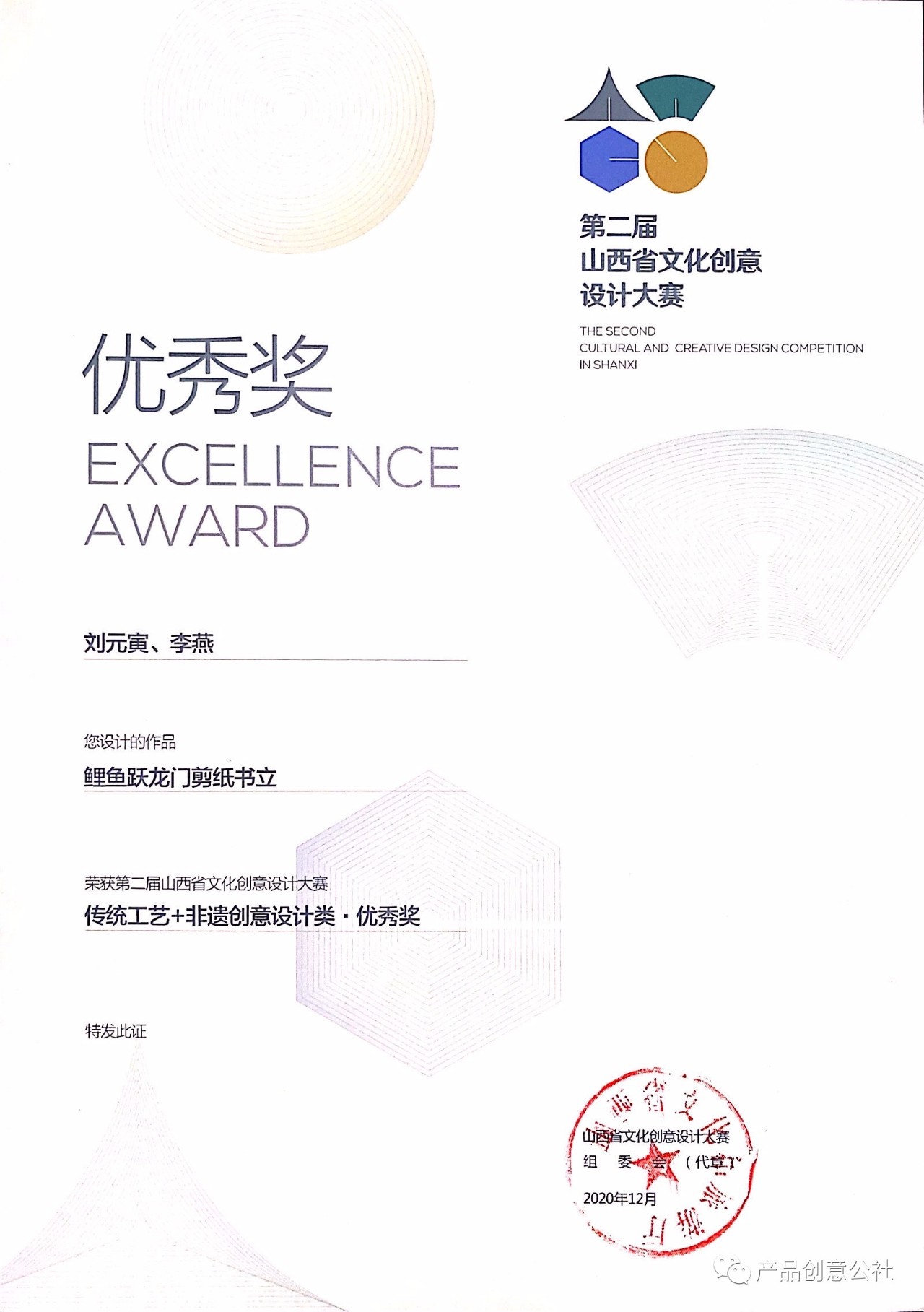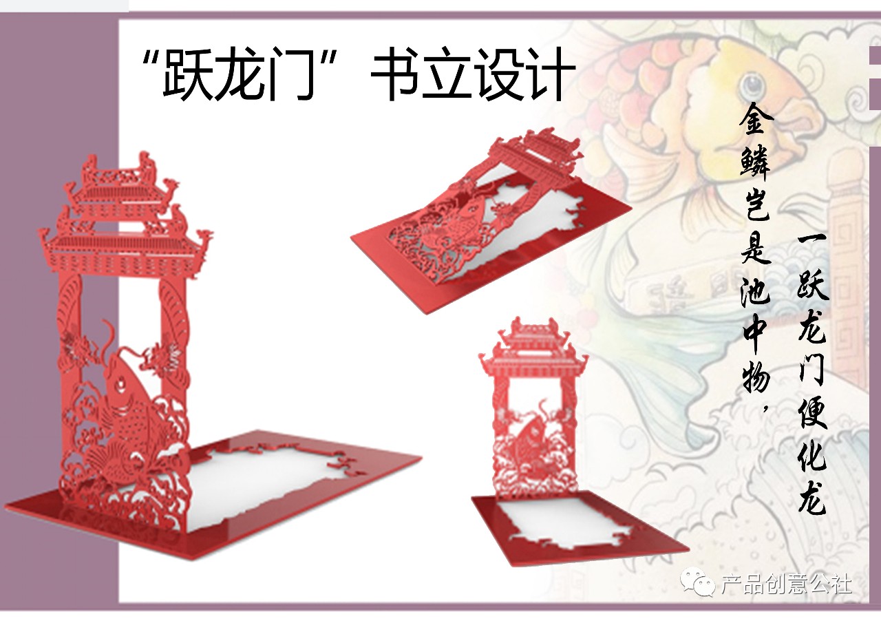 设计说明:这款设计将壶口当地黄河鲤鱼跃龙门传说和山西剪纸非遗与现代书立设计相结合。当地传说中一直以来就有黄河鲤鱼逆流而上,跃过龙门飞升化龙的典故。鲤鱼跃龙门有着迎难而上、努力拼搏的寓意。这款设计定位人群为学生,本身学生的考学压力就很大,在学习中便是不进则退,就如同这条试图跃过龙门的小鱼,很容易引起共鸣。壶口当地传说中一直以来就有黄河鲤鱼逆流而上,跃过龙门飞升化龙的典故。鲤鱼跃龙门有着迎难而上、努力拼搏的寓意。这款设计采用金属板材压制成型,为了给予剪纸书立更多的展示形态,同时考虑到文创产品的便携性,如果旅游纪念品的体量较大,则不好携带,一定程度上限制了购买力。因此我们通过结构处理,改变了传统书立的结构形态,在不用时可以将书立折叠起来,方便游客的购买,同时也节约了包装成本。