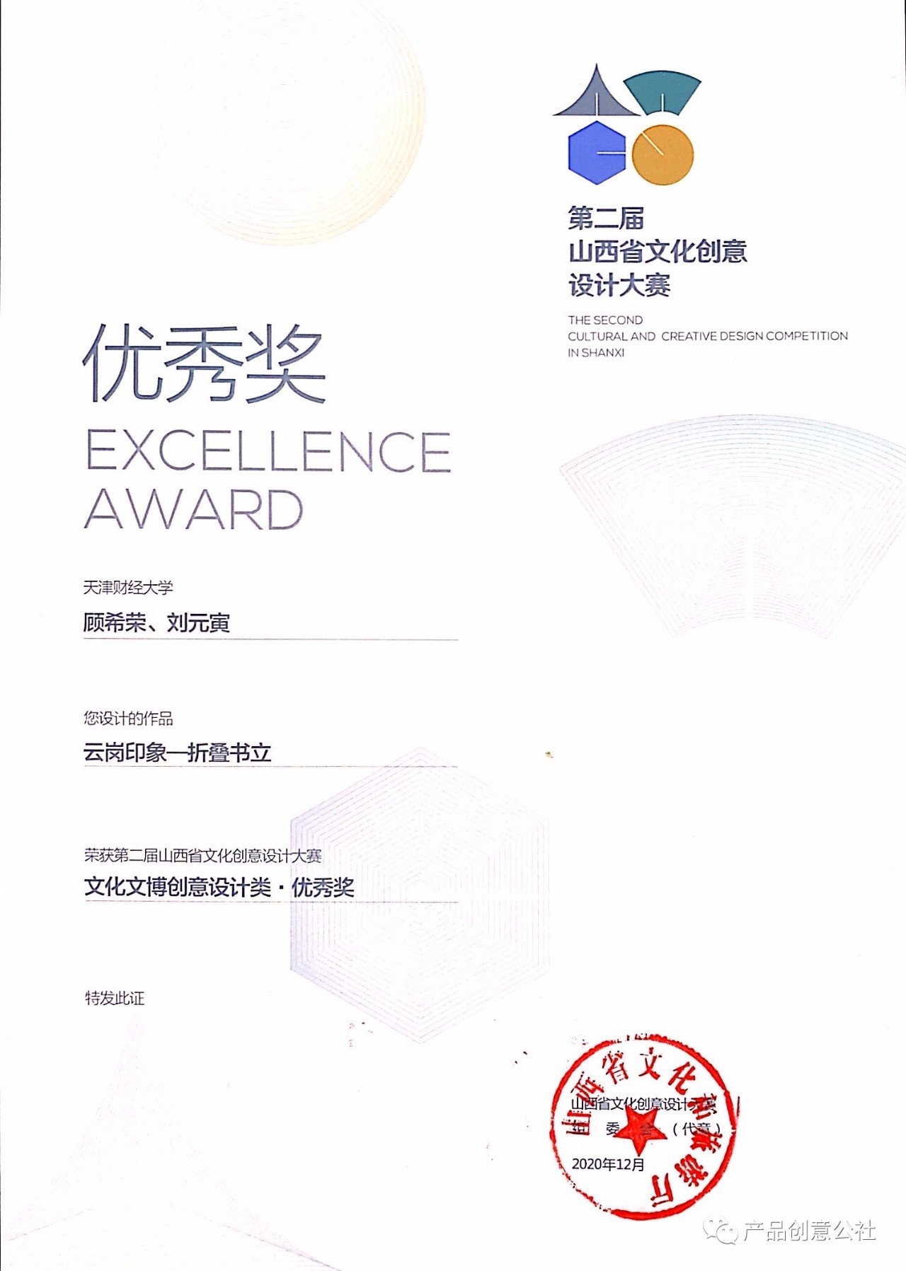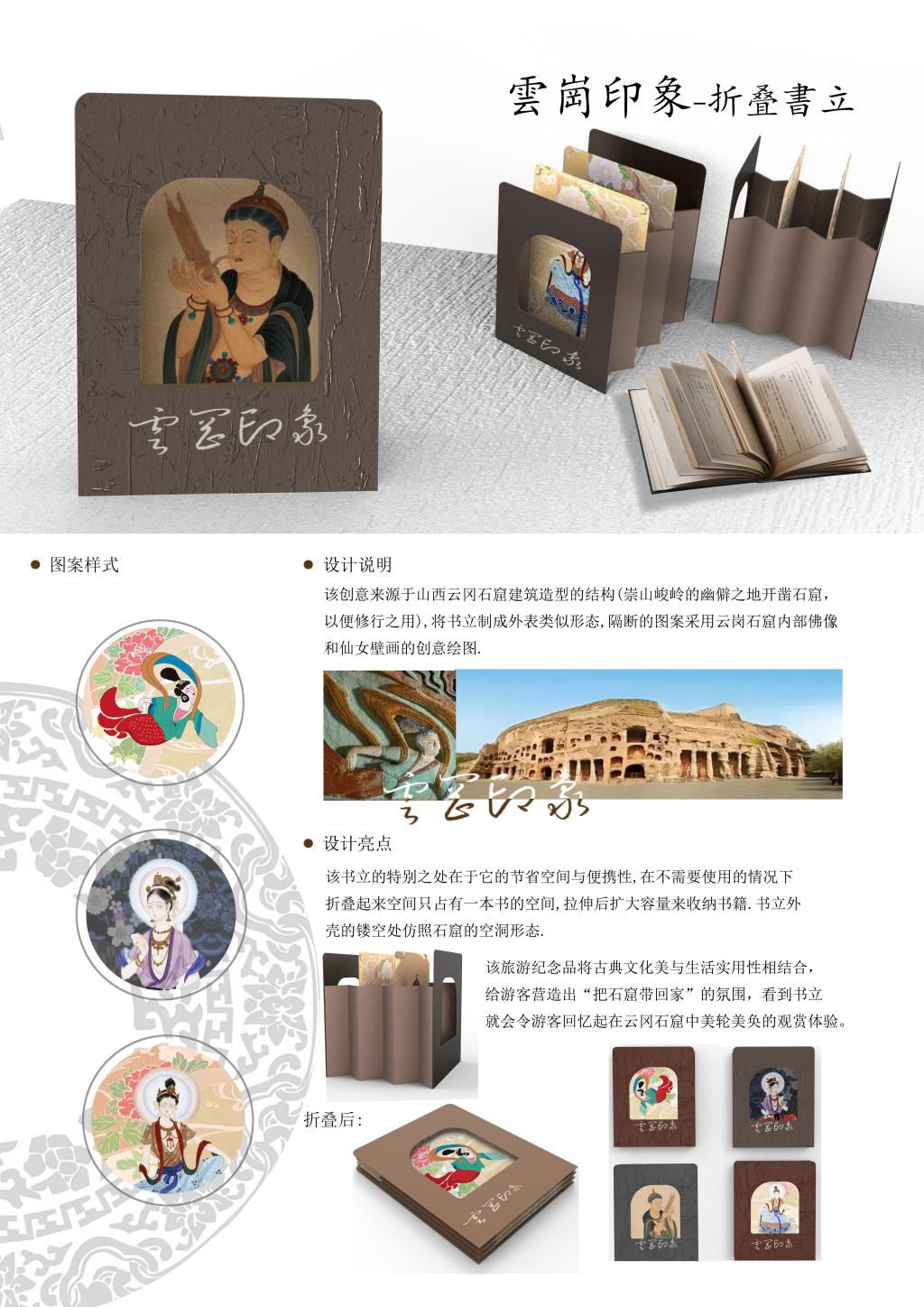 设计说明:这云冈印象-折叠书立创意的来源在于山西云岗建筑造型的结构,隔断的图案来自于石窟内部佛像和仙女壁画的创意绘图,将古典美与生活实用相结合,带给使用者美轮美奂的文化体验与便捷性。